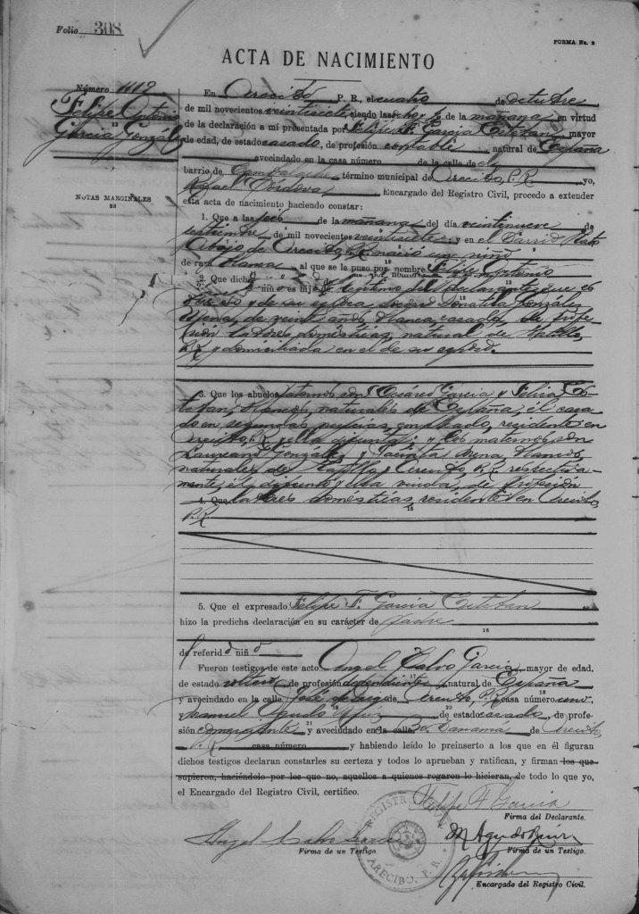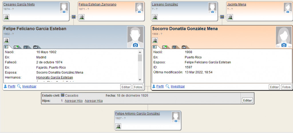 Cesáreo García Nieto y Felisa Esteban Zamorano se casan por poderes, él estaba en Puerto Rico y ella en Valladolid. En 1897, los dos ya en Puerto Rico, celebran el matrimonio eclesiástico en la iglesia de San Francisco de Asís en la ciudad de San Juan Bautista. Tuvieron seis hijos: Honorato, Felipe Feliciano, Ángela Elvira, Juan Ángel, Laureana y María Angustias. Felisa, la mujer de Cesáreo falleció relativamente pronto.