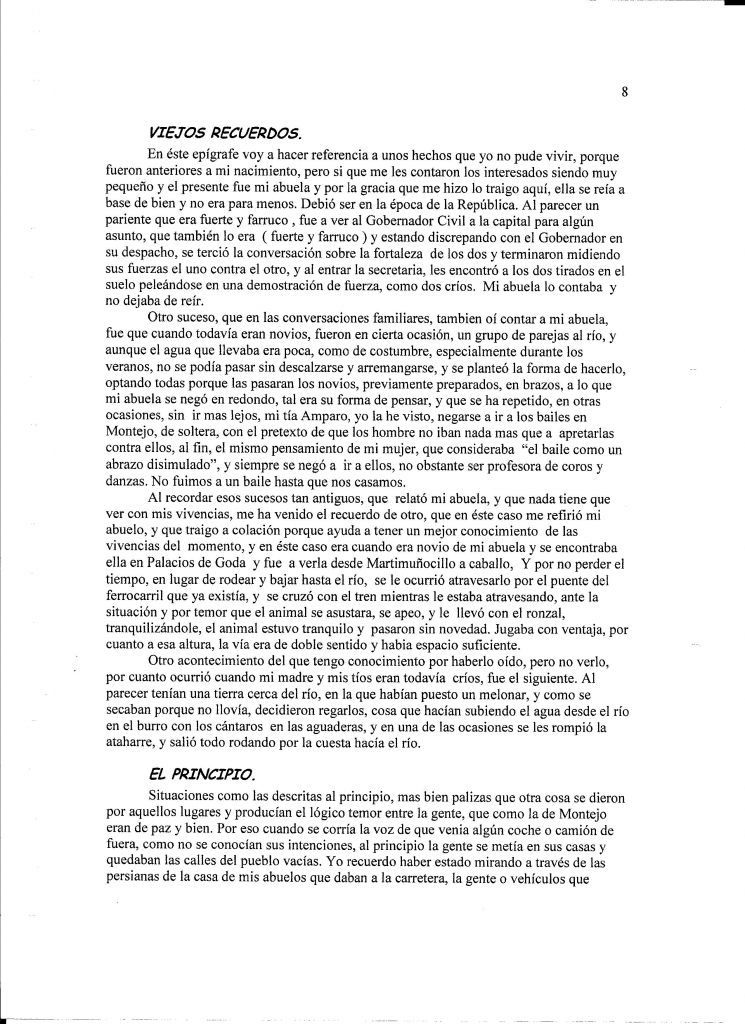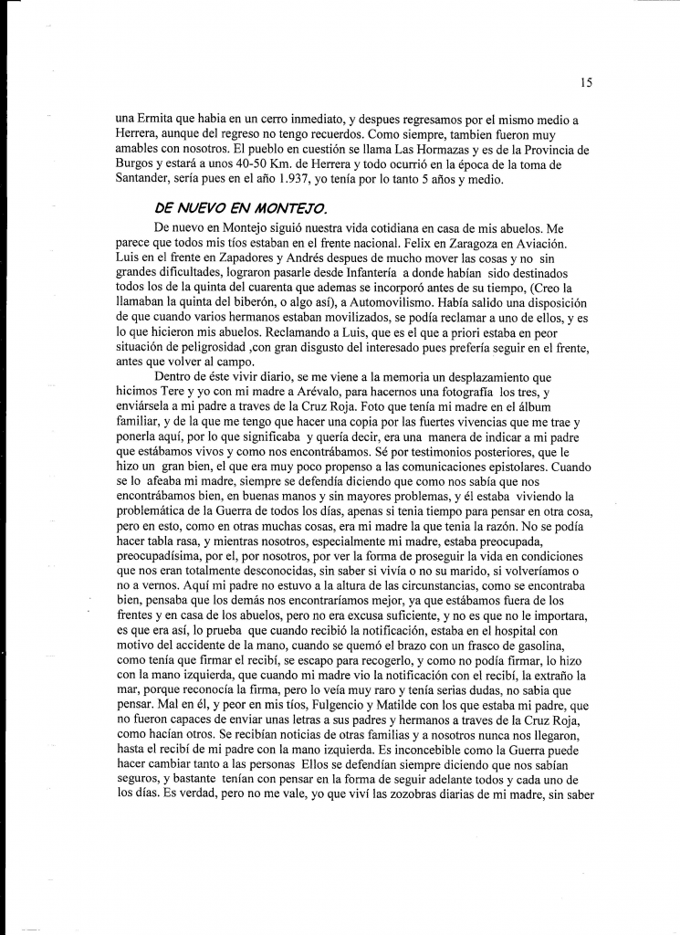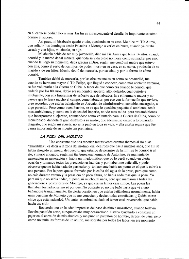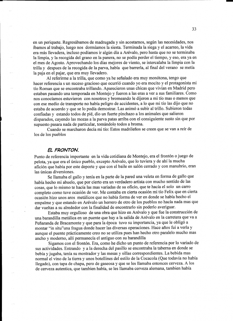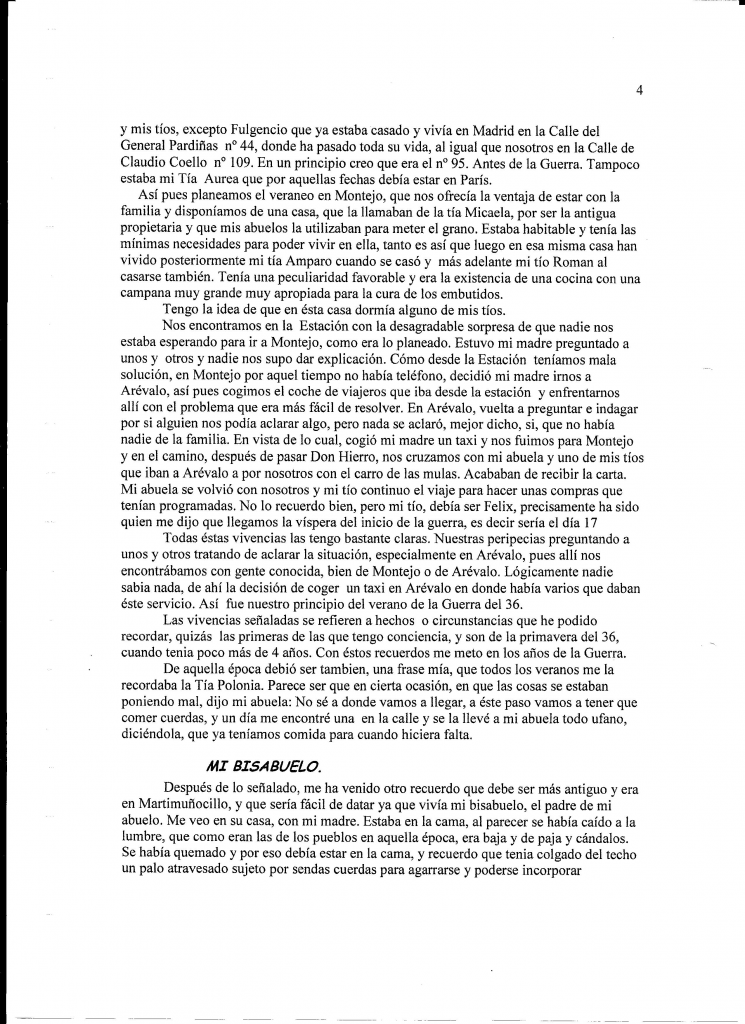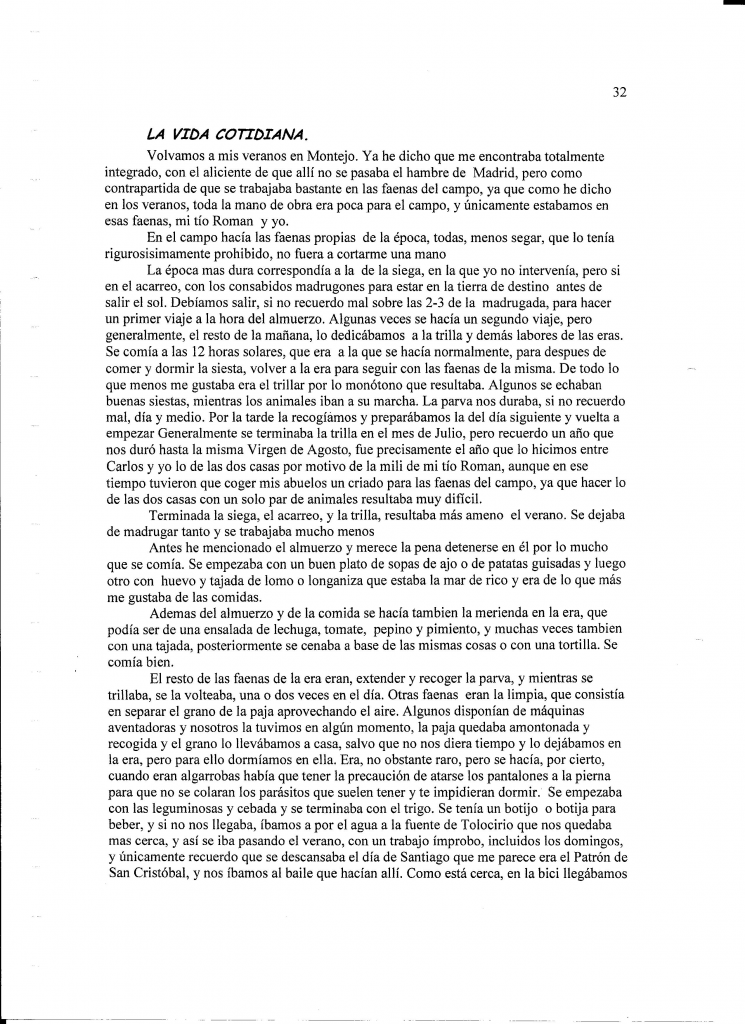 Como continuación al último relato, hoy comienzo con la inserción de los primeros folios que cuentan la historia que vivió otro niño en Montejo en los años de la Guerra Civil y, que como el propio cronista manifiesta, su intención es plasmar por escrito sus vivencias, recoger viejos recuerdos para que quede constancia de ciertas costumbres, muchas de las cuales seguramente sean desconocidas por las nuevas generaciones.